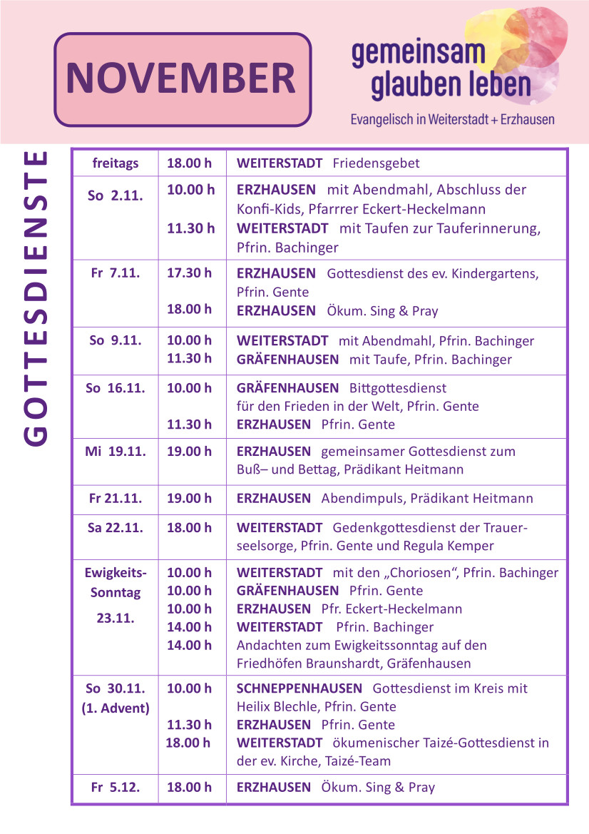 Seit einiger Zeit bilden wir, die drei Kirchengemeinden Erzhausen, Gräfenhausen-Schneppenhausen und Weiterstadt einen Nachbarschaftsraum. In diesem „Raum“ wollen wir als ev. Christ*innen nun „gemeinsam glauben leben“, gerne mit Ihnen und mit Dir zusammen.