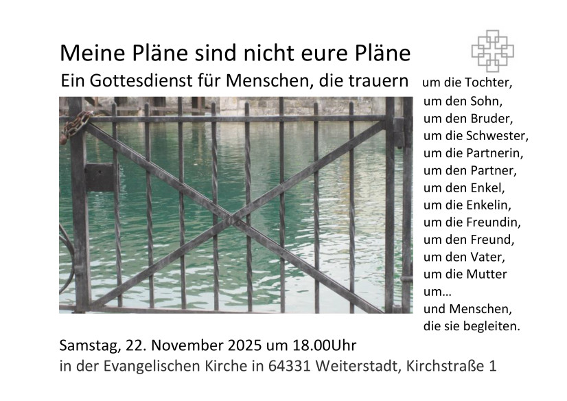 Event details 22. November 2025 18:00 Evang. Kirche Weiterstadt Kirchstr. 1 64331 Weiterstadt Save Event to Calendar Save to iCalendar Save to Google Calendar Save to Outlook Save to Outlook Online Save to Yahoo! Calendar