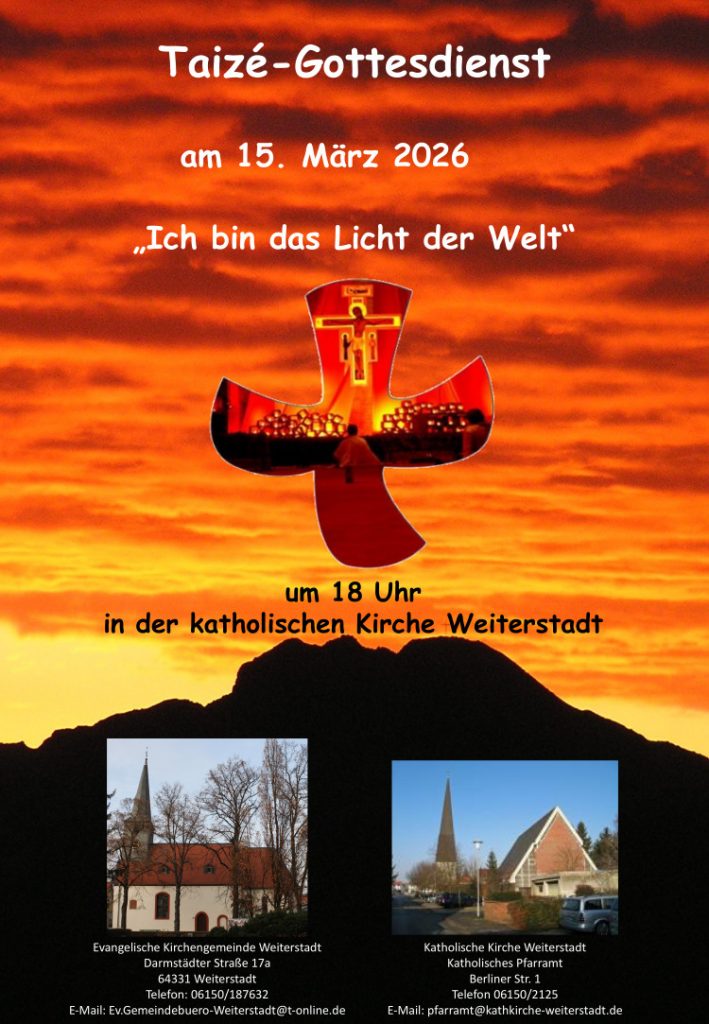 Event details 15. März 2026 18:00 Katholische Kirche Weiterstadt St. Johannes der Täufer Berliner Str. 1 64331 Weiterstadt Save Event to Calendar Save to iCalendar Save to Google Calendar Save to Outlook Save to Outlook Online Save to Yahoo! Calendar